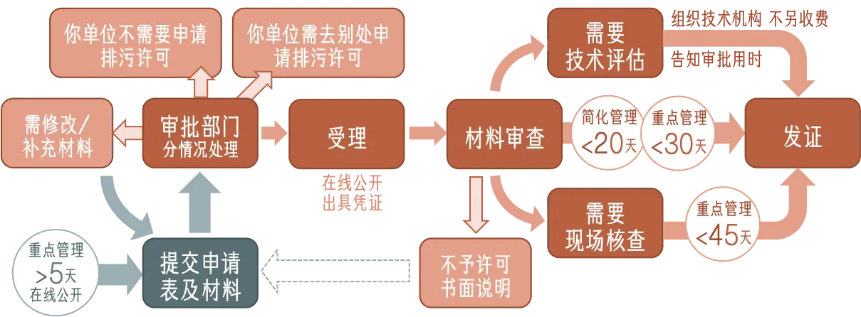 排污许可的申请工作优先采取线上方式。应注意,如果一个单位有两个以上生产经营场所,例如很多企业有多个厂区时,需要分别申请取得排污许可证。对简化管理单位,可以直接申请;对重点管理单位,第一步还需要在“全国排污许可证管理信息平台”填写单位的基本信息和说明材料,并向社会公开5个工作日以上,之后才可以正式提交申请表、申请许可证。